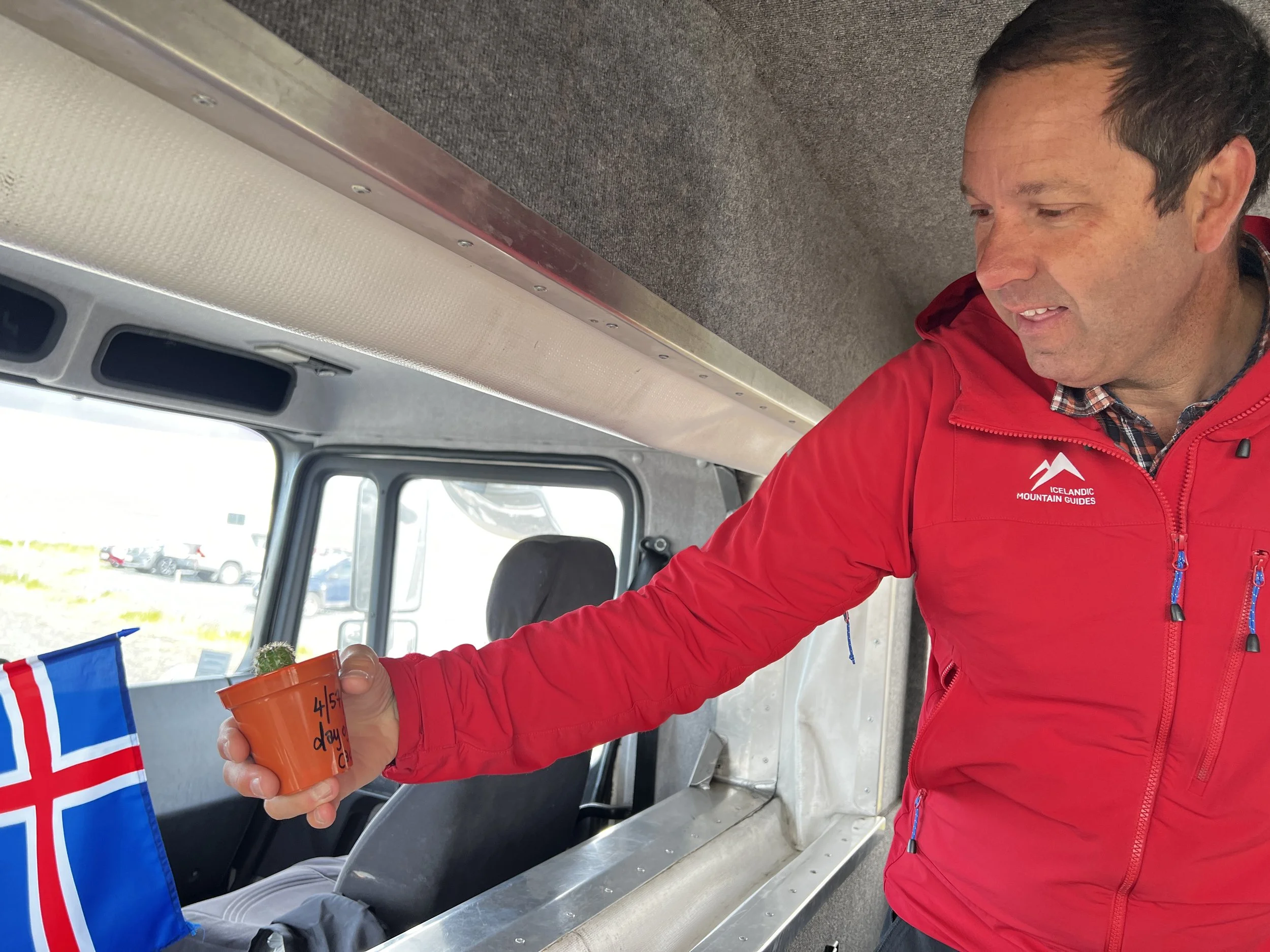 Great guy Fernando with his cactus. Fernando is the shuttle bus driver to the abandoned DC3 wreck in the south of Iceland.
