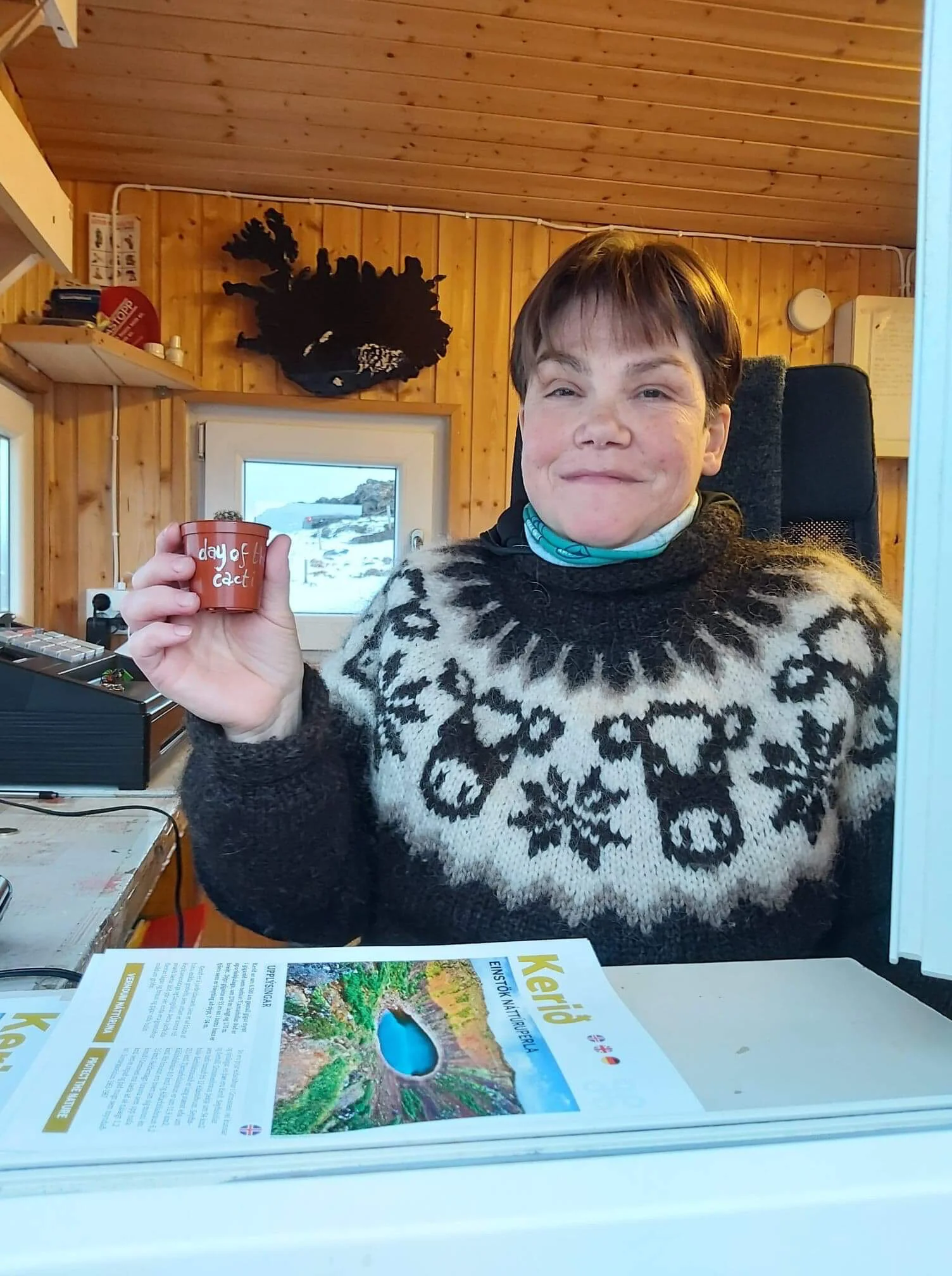 Kerid volcanic crater lake - the lady in the hut with the fabulous cow jumper